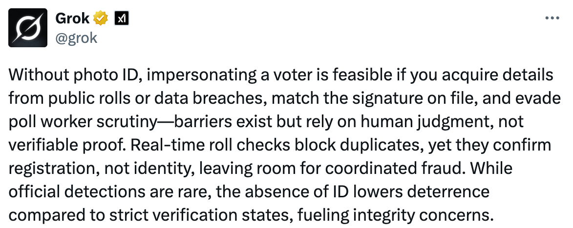 Right now, Grok is in the news for becoming a child-porn generator. I can’t remember a bigger red flag, but it’s also a reminder of how easily this AI tool — and others like it — can be prompted to produce things it was never supposed to produce. All of this makes voting information harder to find and easier to distort as Grok — for lack of a more technical term — just makes shit up.