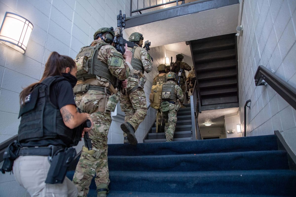 Flashbang grenades, drones, and armed men rappelling onto the roof from Black Hawk helicopters were all part of a deployment of resources and show of force grossly disproportionate to storming an apartment building filled with families in the dead of night, but well-suited to a dramatic social media reel captioned: “Darkness is no longer your ally. We will find you.”