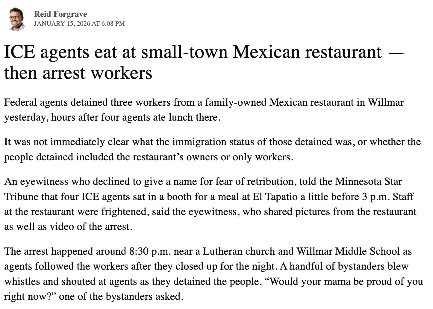 I am also thinking about how the 3,000 federal immigration officers deployed in the city right now are five times larger than Minneapolis’ 600 police officers. They’re behaving with arrogance and impunity. According to one press report, ICE agents ate out in one local Mexican restaurant and then detained the workers serving them.