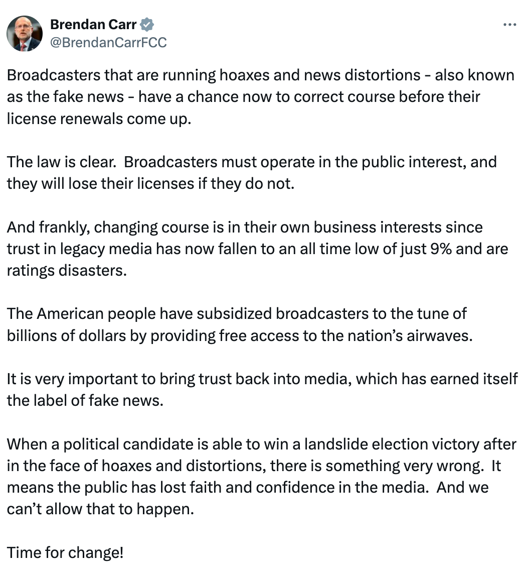 Brendan Carr is right about one thing: “The public has lost faith and confidence in the media.” But it’s for failing to challenge Trump’s lies, not for furthering them. The only way threats and lies stop is if media companies start calling their bluff.
