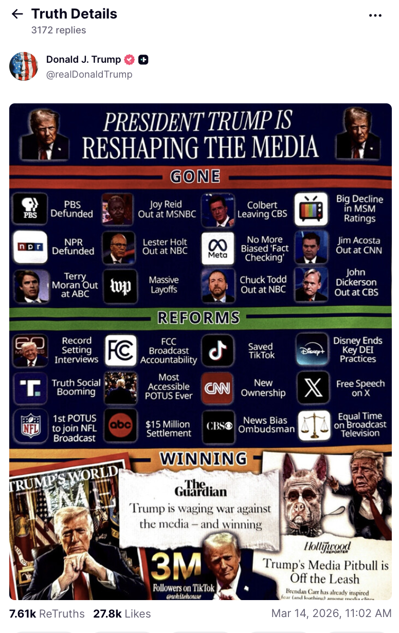 Trump also posted a bizarre graphic touting his victories over the media that looks like it was cut and pasted together by a middle schooler. It trumpets the firings of Stephen Colbert and several prominent journalists, the “massive layoffs” at The Washington Post and the defunding of public media, as well as “new ownership” of CNN, saving TikTok, and being “the 1st POTUS to join NFL broadcast.”